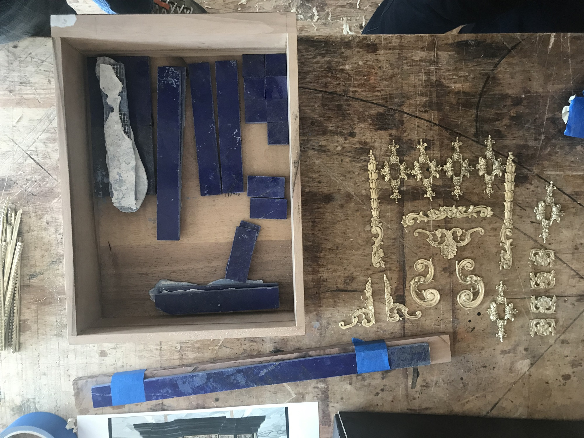 Kolejny etap prac zakładał okleinowanie konstrukcji, czyli pokrycie jasnego drewna lipowego fornirem hebanowym. Fornir, inaczej okleina, to cienki płat drewna służący jako zewnętrzna warstwa zdobiąca mebel. Technika okleinowania znana jest od starożytności, a jednym z jej celów jest oszczędzanie rzadkich, wzorzystych gatunków drewna. Ta metoda zdobnicza daje możliwość układania płatów drewna w skomplikowane wzory geometryczne, a nawet jeszcze bardziej złożone rysunki. Wyzwaniem było jednak zdobycie odpowiednich materiałów do rekonstrukcji. Bezcenne okazały się kontakty z rzemieślnikami różnych specjalności. Specjalnie zakupiono tarcicę hebanową, czyli deski niepoddane jeszcze obróbce stolarskiej. Dokonano też zakupu kamienia, gdy – szczęśliwie – na aukcjach internetowych pojawiła się duża płyta lapis lazuli. Po dokładnym zwymiarowaniu pocięto ją na fragmenty wymaganej wielkości i grubości – chodziło o wycięcie bardzo cienkich „listków” (płytek). Wyzwanie stanowił rodzaj kamienia, lapis lazuli jest bowiem niejednorodny, zawiera w swojej strukturze kryształy innych minerałów, drobinki metali i inne zanieczyszczenia. Często też w jego masie znajdują się mikroskopijne spękania, niewidoczne na pierwszy rzut oka. Wszystkie te zjawiska wpływają na osłabienie struktury, powodują nagłe pękanie czy wykruszanie podczas cięcia lub polerowania, w najmniej oczekiwanym miejscu. Dlatego, po przeprowadzeniu szeregu prób, wybrano najskuteczniejszą metodę wzmacniania kamienia przed docinaniem; wzmacnianie powierzchni poprzez prowizoryczne przyklejanie do niej siatki poliestrowej, przejmującej naprężenia powstałe podczas wycinania. Następnie po uzyskaniu odpowiedniej grubości płytek (około 5 mm) wzmocnienie usuwano. Dzięki temu rozwiązaniu udało się uniknąć niepotrzebnych strat cennego materiału, którego deficyt był od początku odczuwalny.