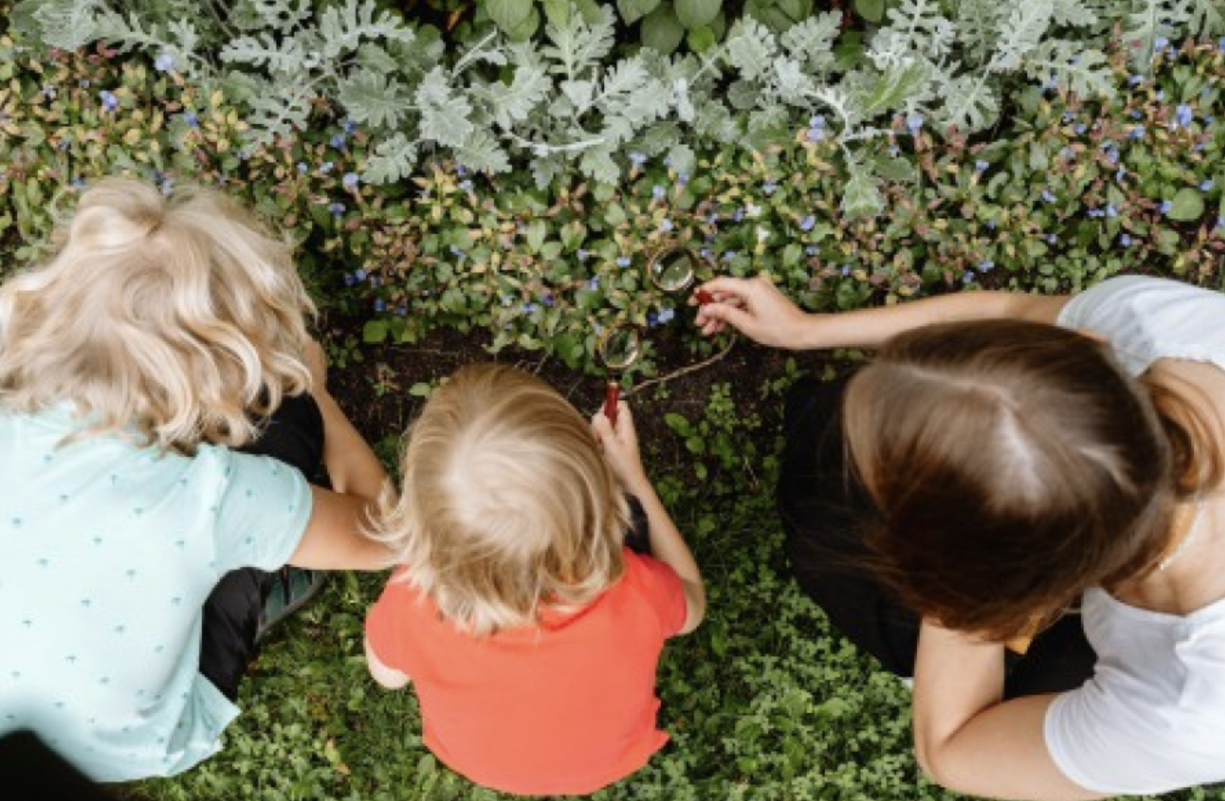 Kolorowe zdjęcie współczesne. Przedstawia trojkę dzieci, które pochylają się nad roślinami. Dziewczynka i mały chłopiec trzymają w rękach lupy i oglądają liście.
