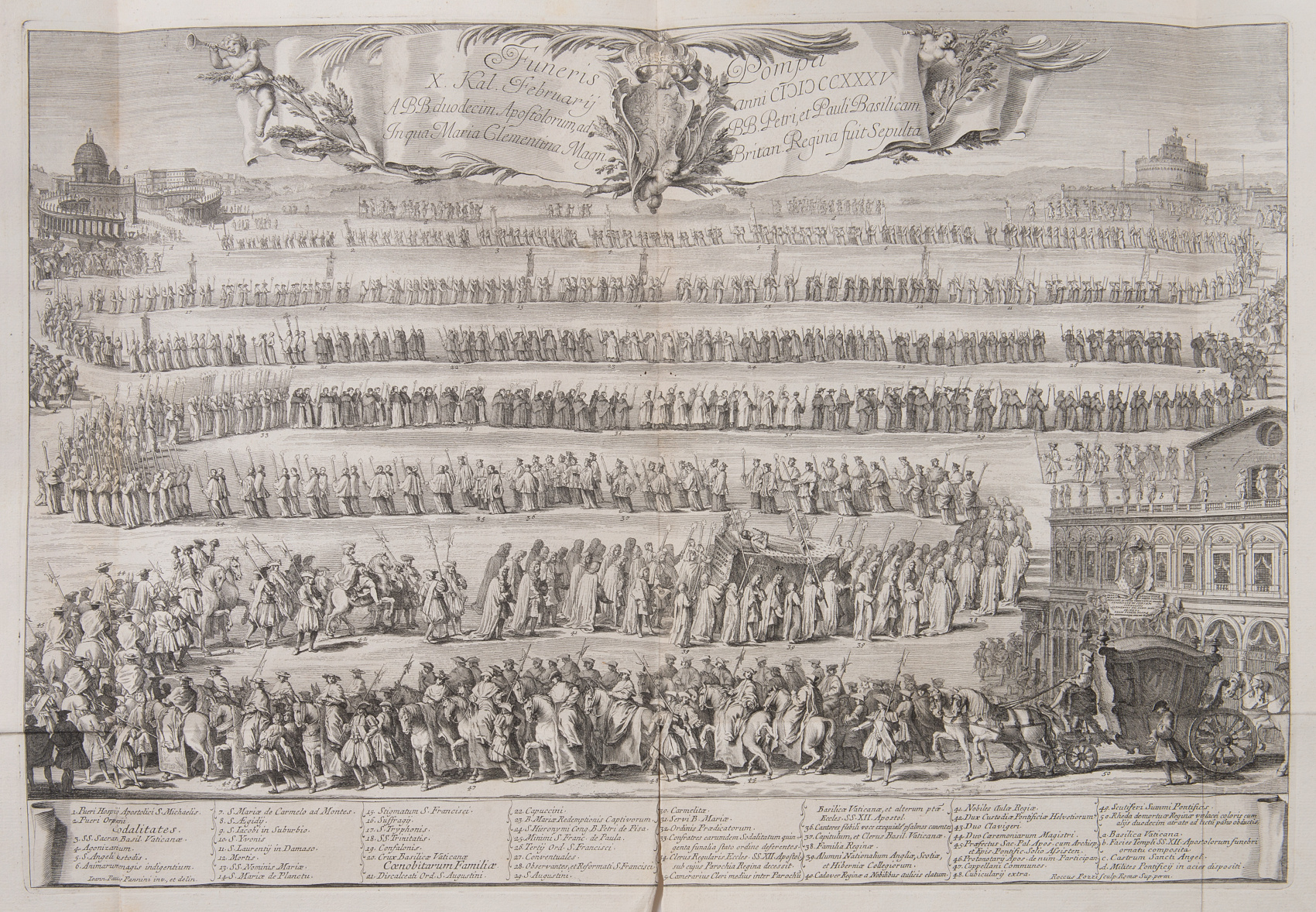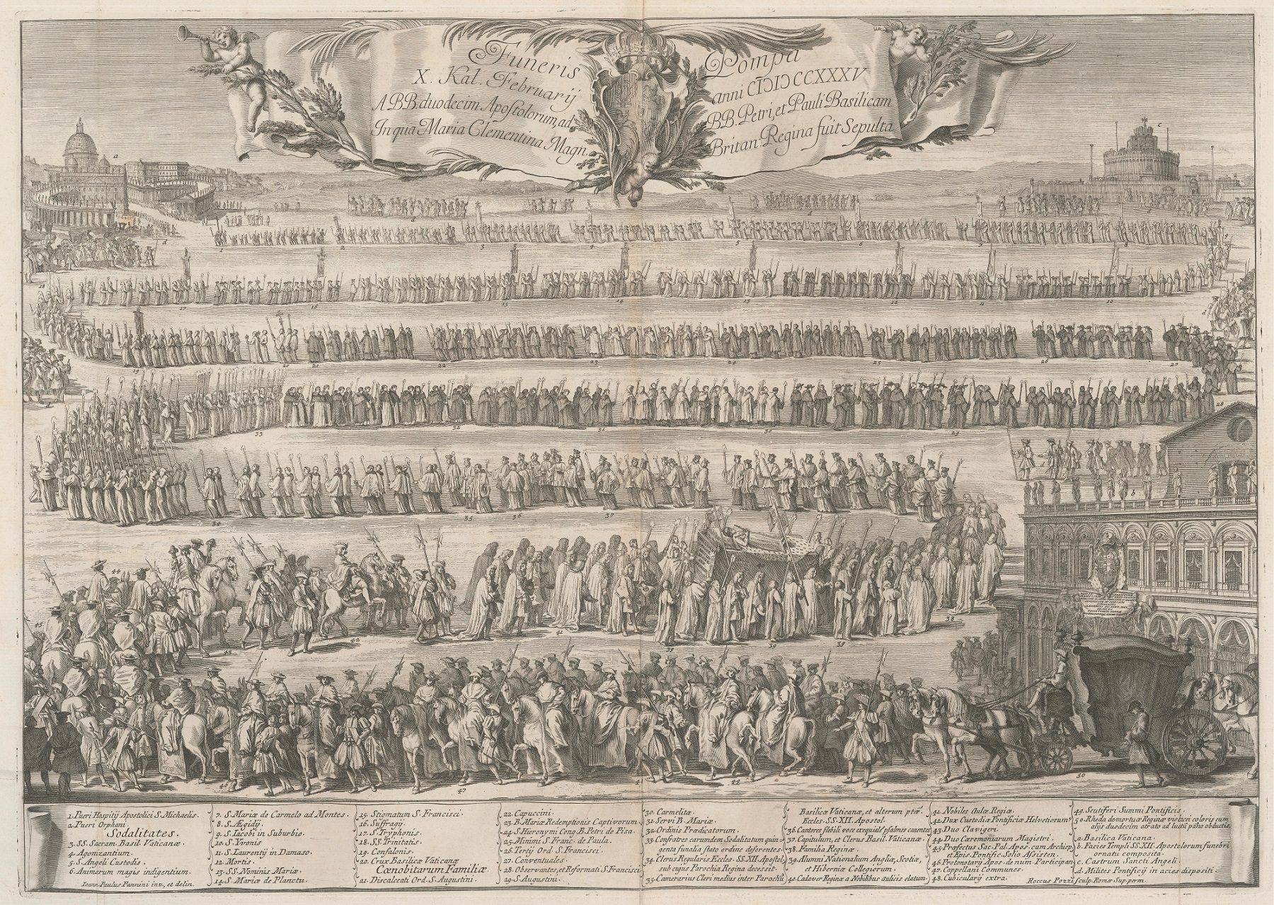 Another illustration from the Parentalia Mariae Clementinae… was a depiction of the funeral procession of Clementina, which set off from the Santi Apostoli church to St. Peter’s Basilica, where the body of Jan III’s granddaughter was finally laid to rest. The procession winds its way through the streets, forming a total of seven parallel sections, situated in increasingly distant planes. Its head, in which one can make out tiny silhouettes of the participants, approaches St. Peter’s Square; the procession is closed by a carriage covered with black cloth, which is moving away from the façade of the Santi Apostoli. In the background, alumni of English, Scottish, and Irish national colleges hold burning torches as they surround the high bier with the body of the queen, dressed in royal (rather than monastic) robes. At the top of the composition floats a gently curled, wide ribbon with an inscription, separated in the middle by a Rococo cartouche topped with a crown, in which are five fields with the coats of arms of Poland. Clementina’s heart remained in a marble urn in her epitaph in the Santi Apostoli church. The engraving was made by the Roman artist Rocco Pozzi (d. c.1780). Below the composition is a legend with the description of the people who participated in the procession.