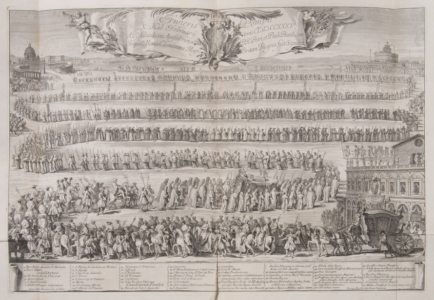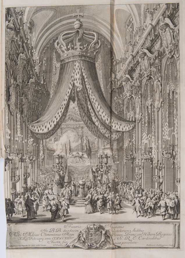In 1736, Giovanni Maria Salvioni’s publishing house in Rome released a bilingual print entitled Parentalia Mariae Clementinae Magn. Britan. Franc. et Hibern. Regin. Jussu Clementis XII Pont. Max, a memorial to Clementina, who died on January 18, 1735, containing her biography and a detailed description of the grand funeral ceremonies organised in Rome at the behest of Pope Clement XII.