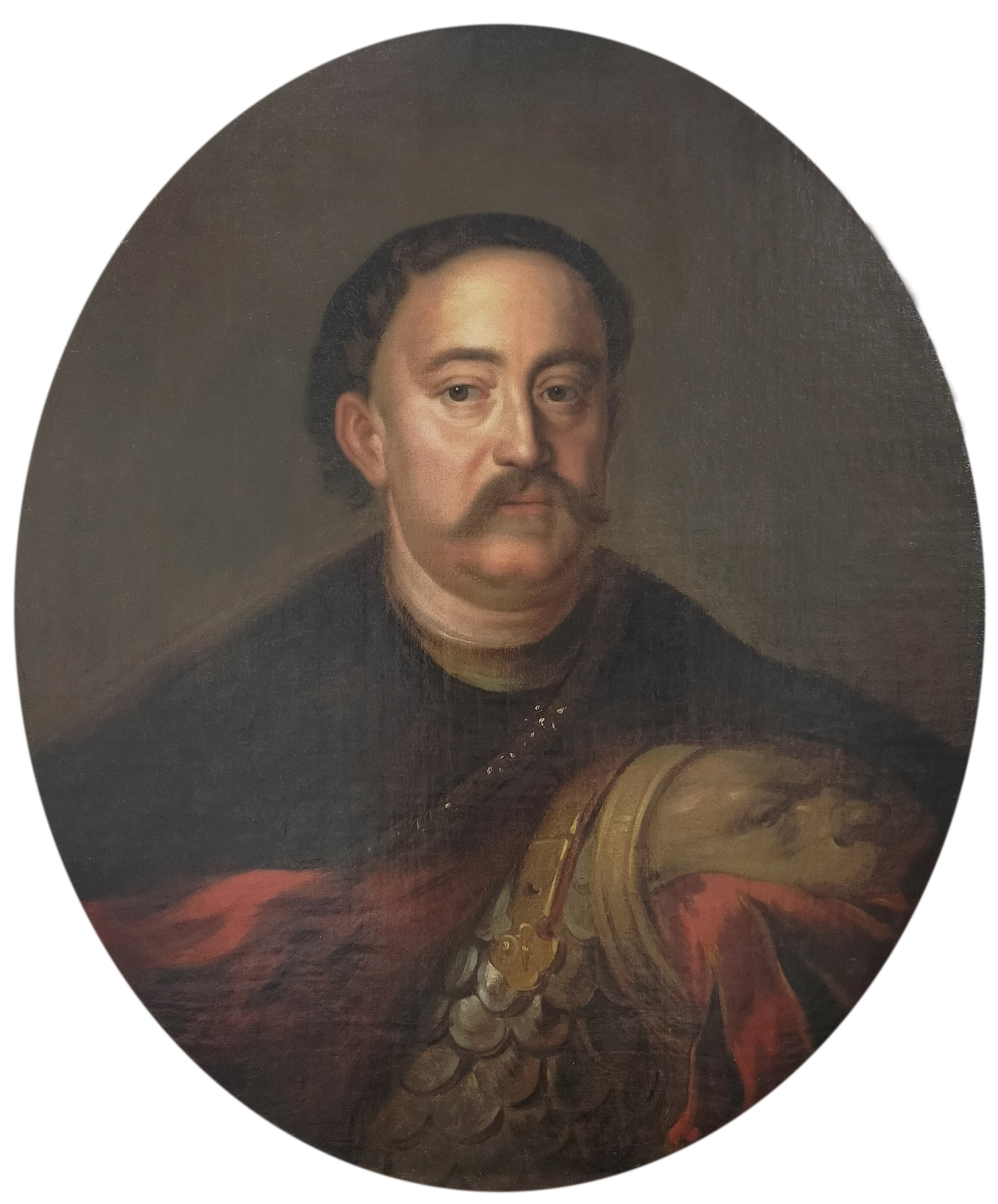 The many portraits of King Jan III were intended to raise his prestige, being an elected monarch within a context of hereditary dynastic rulers. In the case of the exiled Stuarts, the aim was to remind people of the rightful rulers of England, Scotland and Ireland. In both of the portraits exhibited, Jan III is presented en buste, dressed in scale armour with a neck guard. The red cloak (delia) with a wide black fur collar spread across the shoulders is fastened with an elongated inlaid clasp. The exposed left shoulder of the sitter is covered by a pauldron in the form of a stylised lion’s mouth, adorned with straps called pteryges. Next to the pauldron, a leather belt with a buckle is on top of the armour, connecting the breastplate to the backplate. The king is depicted as a man in his prime, with a high forehead and cropped hair, and a characteristic parting on the right side, visible in both images.