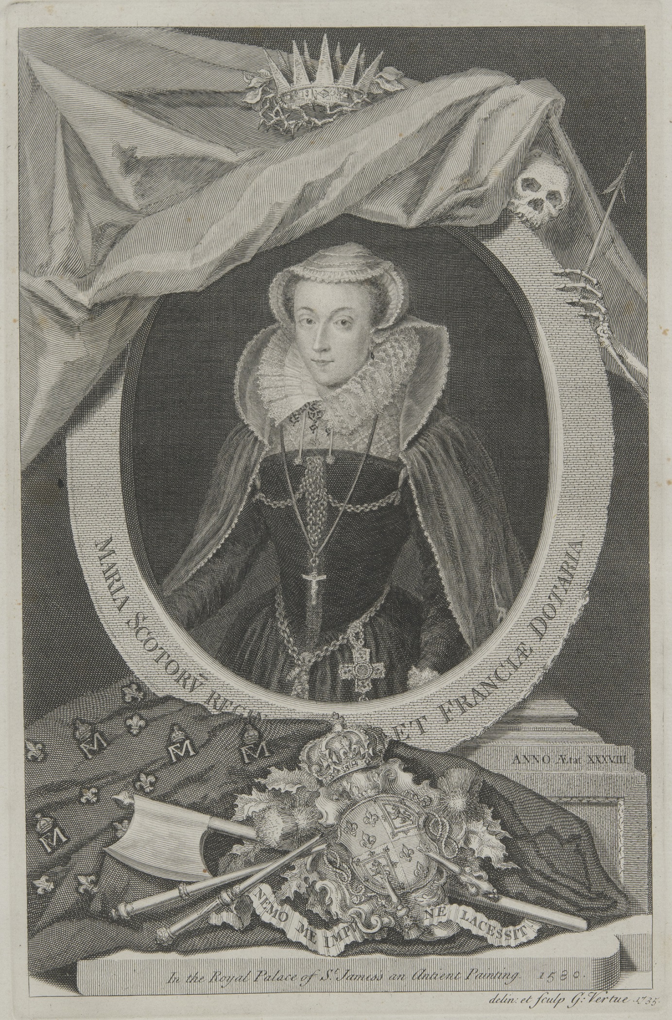 The prayer book contains a quatrain written by the queen herself, in which Mary thanks her aunt for the gift. It bears the anagrammatic motto Va tu meriteras (Go, you will deserve) and the joint monogram of François and Mary. The binding was made in England at the end of the 18th century by the famous Edwards family of Halifax and decorated using a special technique, with an illumination painted under the underside of the cover of translucent vellum.