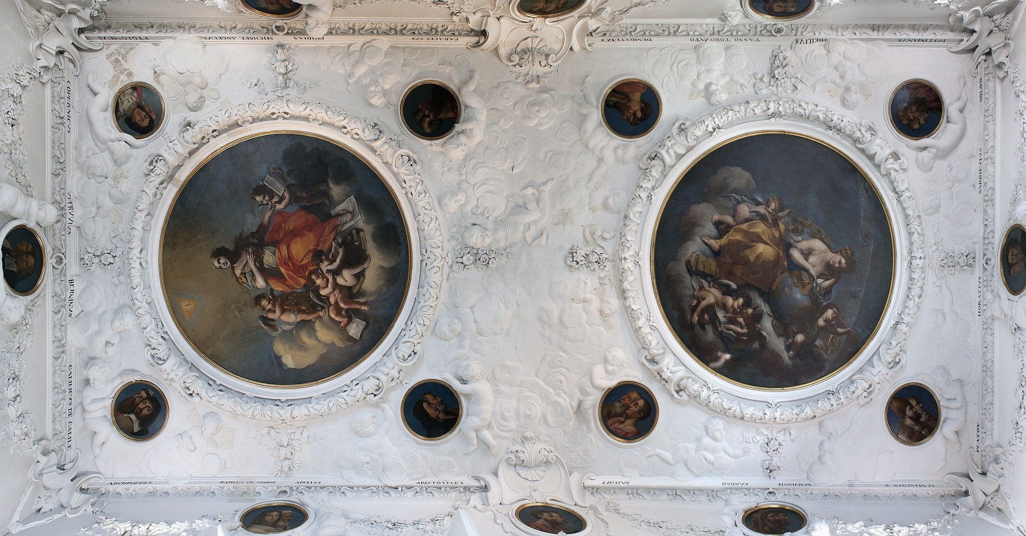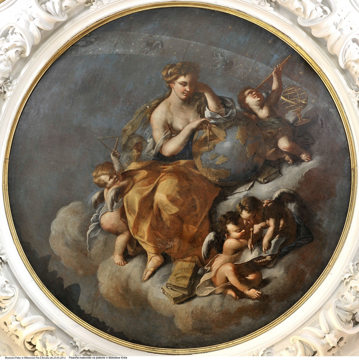 Na malarską dekorację sufitu biblioteki składają się dwa duże tonda z przedstawieniami alegorycznymi określanymi w literaturze jako Teologia oraz Filozofia (przede wszystkim w oparciu o terminy jakimi posłużył się Locci w jednym z listów do króla), a także szesnaście podwójnych portretów starożytnych i nowożytnych uczonych, polityków i artystów. Dwa główne plafony są dość typowymi przedstawieniami uosobionych w postaciach kobiecych najważniejszych ówcześnie (by nie napisać wszystkich) dziedzin ludzkiej wiedzy. Ich pierwotnym, później wielokrotnie powtarzanym i przetwarzanym wzorem ideowym są okrągłe wizerunki teologii, filozofii, prawa i poezji pędzla Rafaela w Stanza della Segnatura w pałacu watykańskim. Podobne przedstawienia odnaleźć można w wielu europejskich bibliotekach, między innymi w Escorialu (mal. Pellegrino Tibaldi), w Palazzo Zuccari w Rzymie (mal. Federico Zuccari), czy w klasztorze na Strahowie w Pradze. Oba wilanowskie plafony stanowią z jednej strony wizualne zobrazowanie wszystkich dziedzin wiedzy, z drugiej – ukazują ich odmienne pochodzenie.