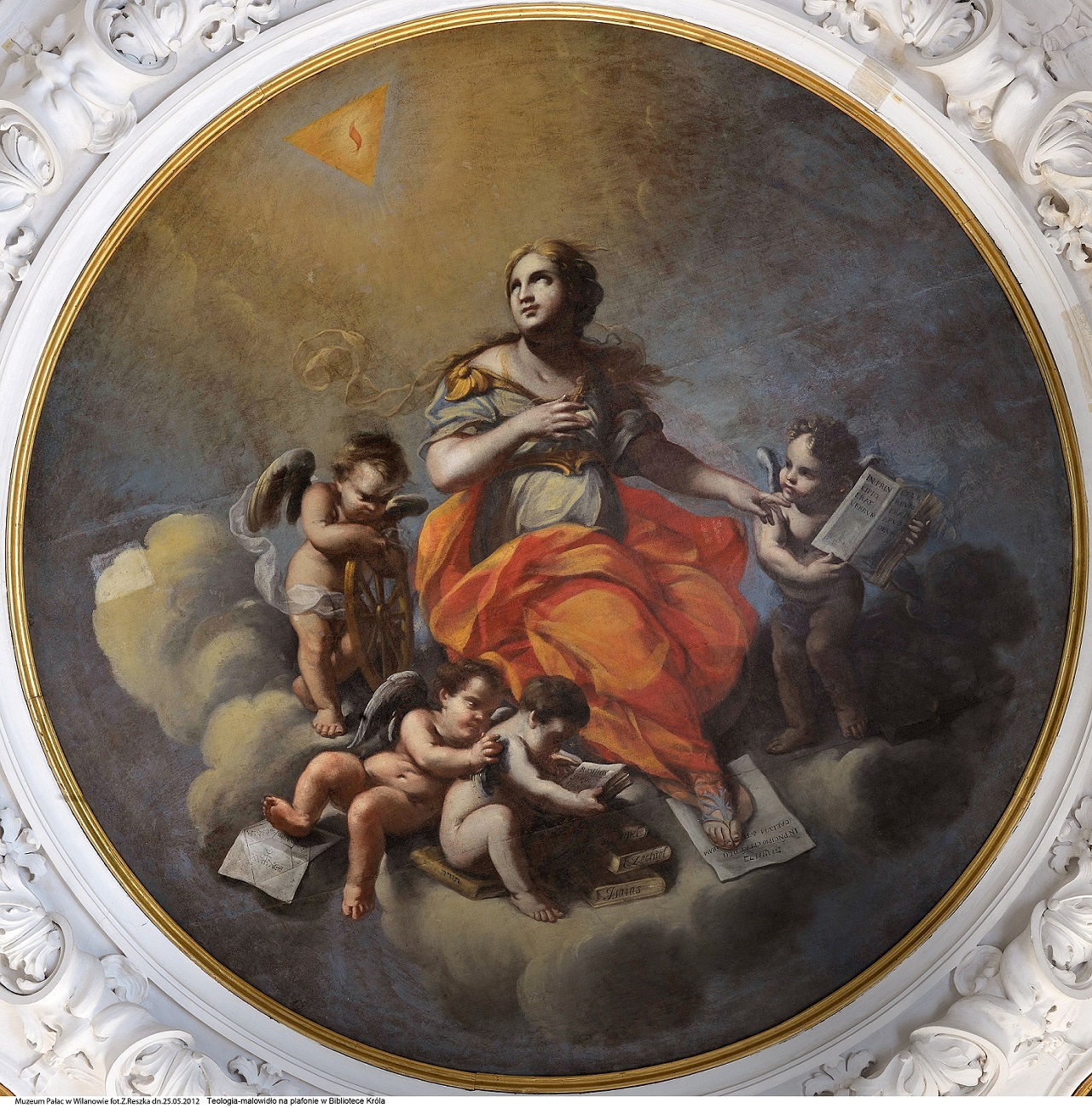 Plafon znajdujący się w północnej części pomieszczenia (po stronie wejścia do Antykamery Króla) przedstawia Teologię. Alegoryczna postać zwraca się w stronę Boskiej Opatrzności, jednocześnie wskazując na księgę, w której zapisano pierwsze słowa Ewangelii według świętego Jana: „Na początku było Słowo, a Słowo było u Boga”. Tak ujęta relacja wskazuje jasno na pochodzenie wszechrzeczy, podobnie jak początkowe słowa Biblii wypisane na karcie pod stopą Teologii oraz hebrajskie słowo oznaczające początek umieszczone na jednym z ukazanych tomów. Uzyskaną w oparciu o boskie objawienie wiedzę przekazują święte teksty przedstawione między innymi pod postaciami ksiąg Starego Testamentu – Izajasza, Ezechiela i Daniela. Księgi te oraz imiona trzech Ojców Kościoła zapisane w woluminie trzymanym przez jedno z puttów wskazują na reprezentowane przez nie obszary i aspekty wiedzy teologicznej – naukę o Słowie Bożym, łasce niezbędnej dla poznania oraz naukę o przymiotach Boga. Znajdujące się po lewej stronie głównej postaci koło jest typowym hieroglificznym symbolem teologii – tak jak koło dotyka tylko niewielkim fragmentem ziemi, tak teologia jest w większości zakryta człowiekowi. Ponownie z Iconologii Cesare Ripy zaczerpnięta jest sama postać Teologii spoglądająca w niebo, siedząca na globie z gwiazdami.