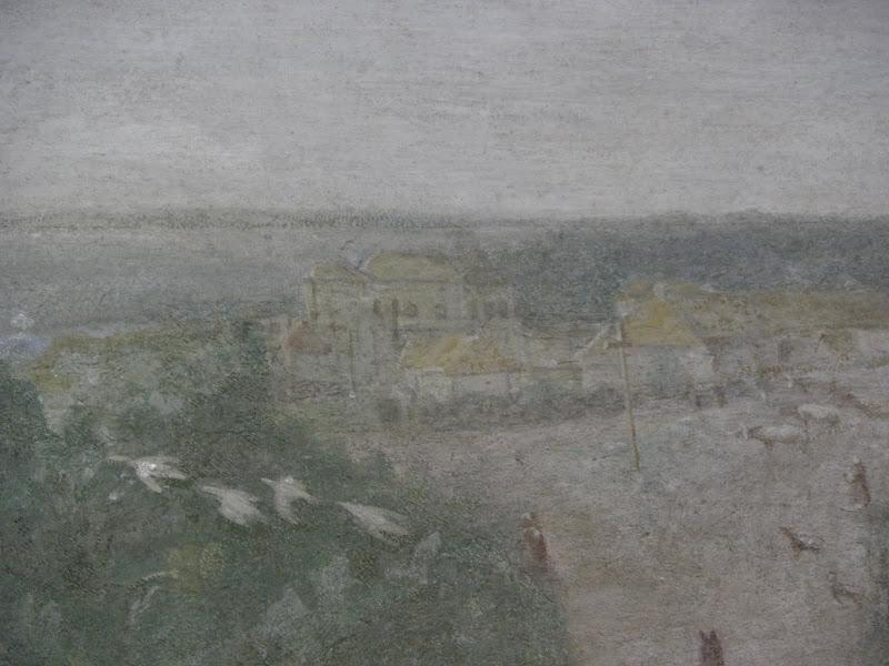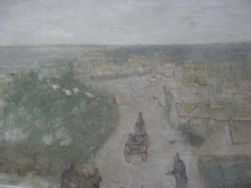 Pejzaż w pastelowych kolorach. Pośrodku kompozycji droga, po której jedzie dorożka. W oddali zabudowania. Jest to fragment fresku z kościoła św. Antoniego z widokiem wsi Czerniaków.