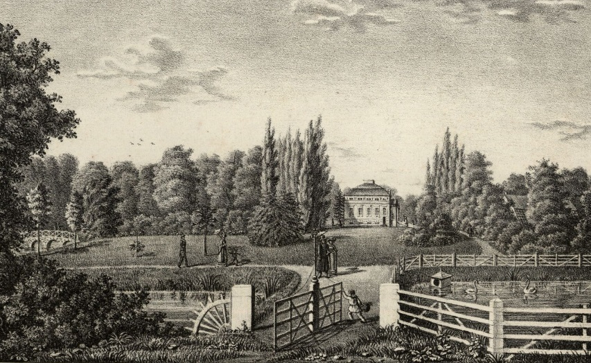 Czarno-białe zdjęcie przedstawia drewniany dom z gankiem. Przed domem dwa drzewa, na trawniku czarny pies. Jest to Dworek w Mereczowszczyźnie, miejsce urodzenia Tadeusza Kościuszki.