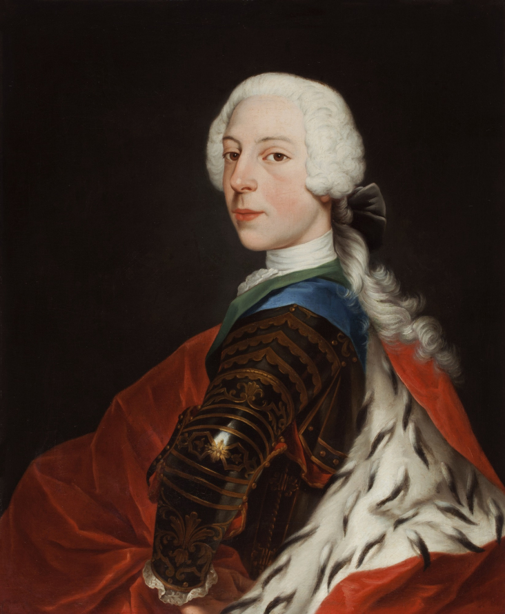 Książę okryty jest obszernym, aksamitnym czerwonym płaszczem podbitym futrem z gronostajów, które podkreśla wysoką rangę portretowanego. Na jego lewym ramieniu widoczna jest błękitna wstęga angielskiego Orderu Podwiązki (św. Jerzego), a na szyi – zielona wstęga szkockiego orderu Ostu (św. Andrzeja). Obaj synowie Jakuba III/VIII zostali udekorowani tymi najważniejszymi odznaczeniami brytyjskimi już w dzieciństwie.