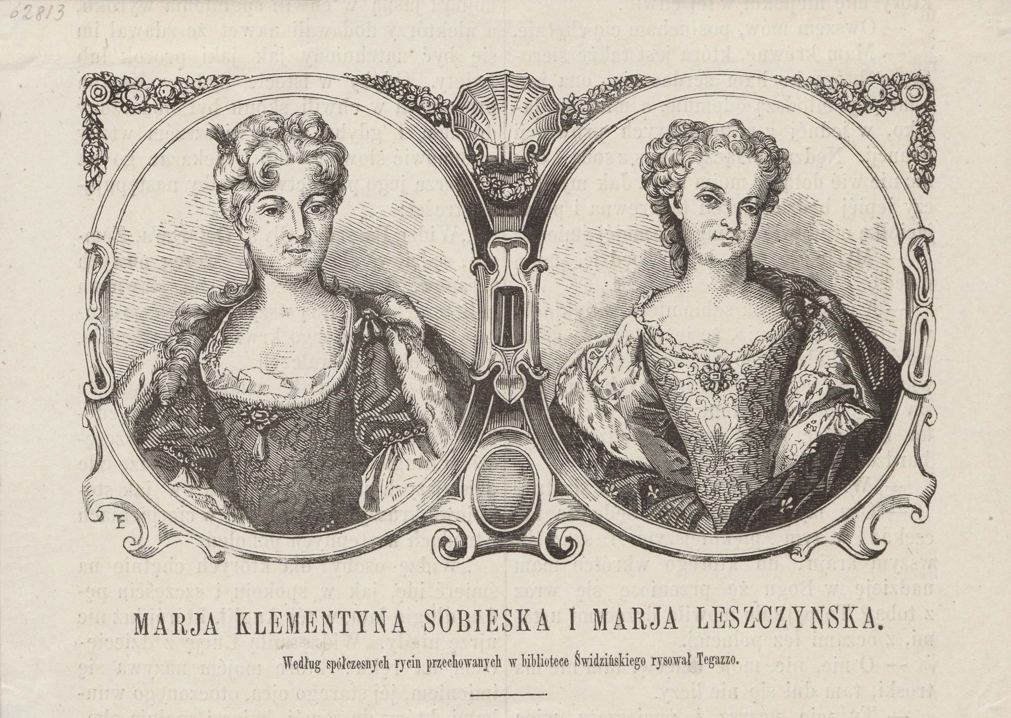 Reprezentacyjna rycina portretowa przedstawia Marię Klementynę Sobieską jako królową Wielkiej Brytanii. Insygnia władzy ograniczone są do leżącej na stole korony i gronostajowego płaszcza okrywającego ramiona postaci. Portret w owalnej ramie otoczonej udrapowaną kotarą umieszczony jest na cokole z kartuszem herbowym, na którym widnieją herby domu Stuartów i rodowy Marii Klementyny. Twórcą ryciny wykonanej na podstawie rysunku, który – jak głosi podpis przy sygnaturze – został narysowany ad vivum czyli z natury, w Rzymie w latach 1719–1724, był szwajcarski rytownik Johann Jakob Frey starszy (1681–1752), wykształcony po 1703 r. w rzymskich pracowniach Carla Maratty i Roberta van Auden-Aerda oraz atelier Arnolda van Westerhouta, specjalizujący się w sporządzaniu okazałych portretów i graficznych kopii dzieł malarskich.