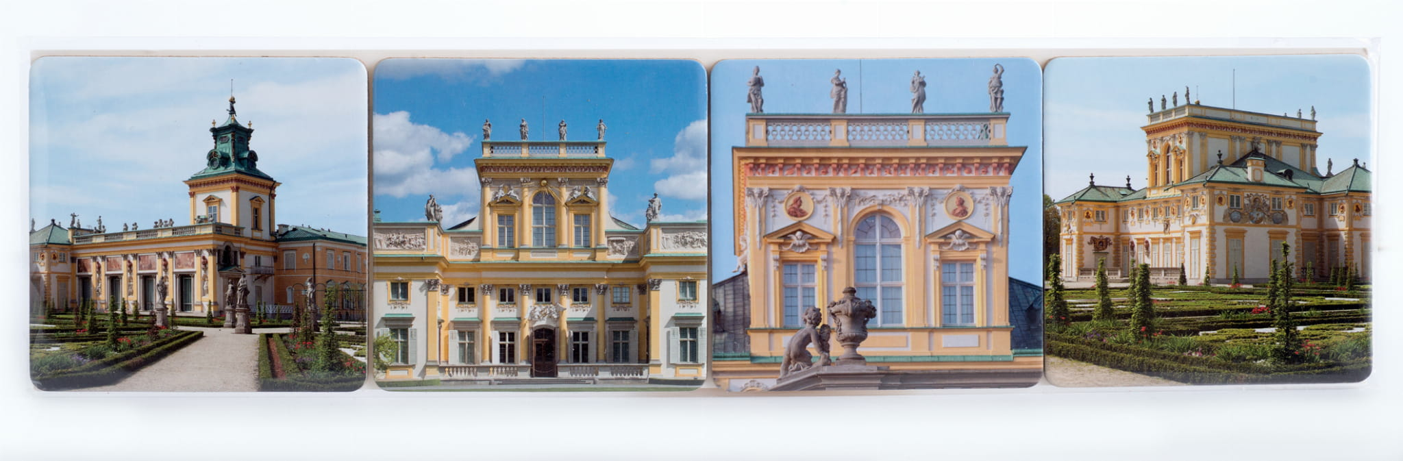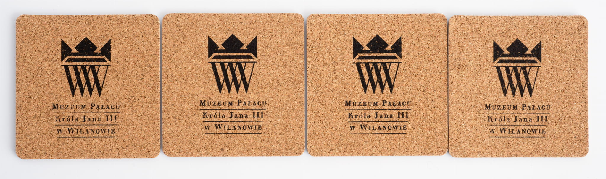 W skład zestawu wchodzą cztery podkładki korkowe o wymiarach 9,3 x 9,3 cm z widokiem na fasadę pałacu wilanowskiego.