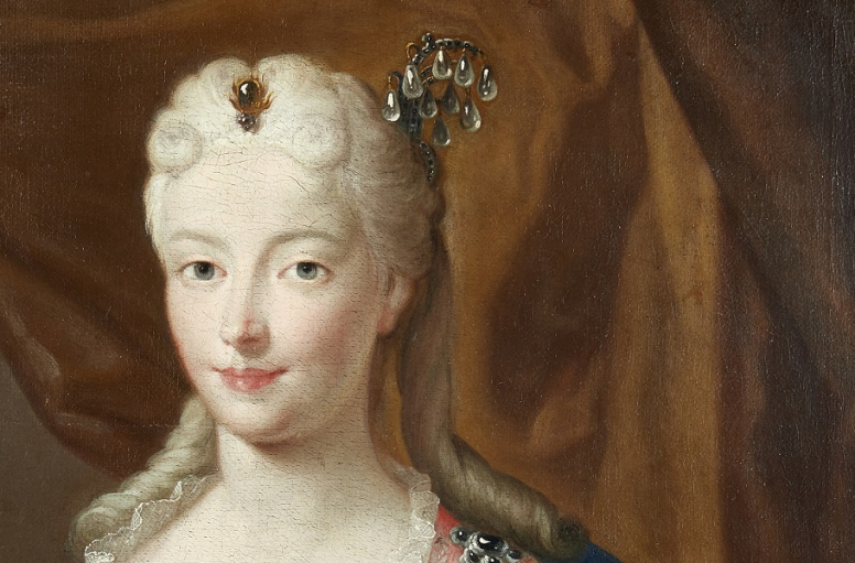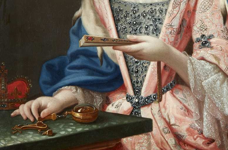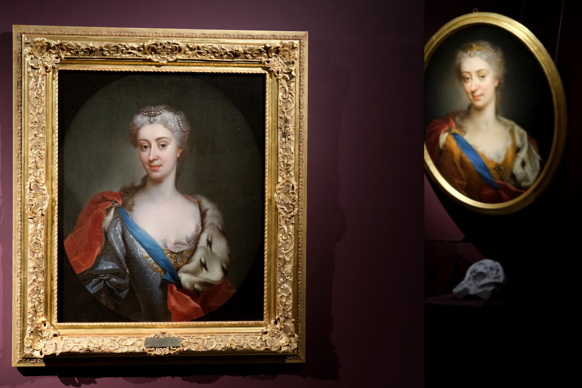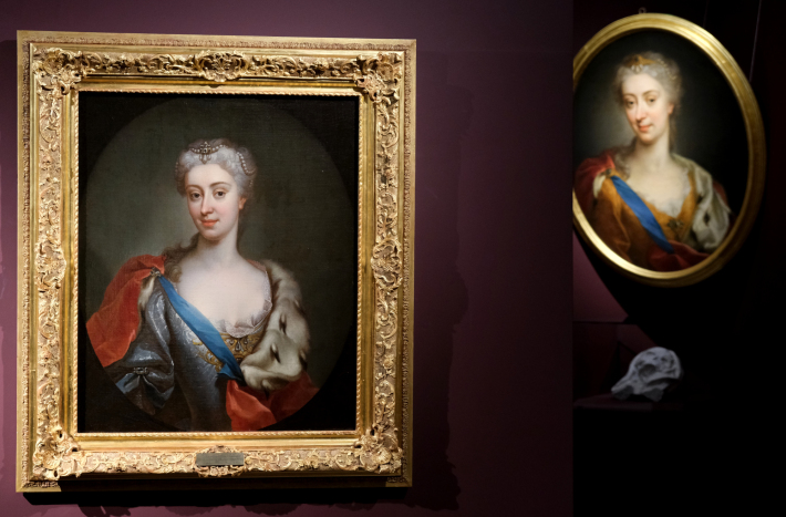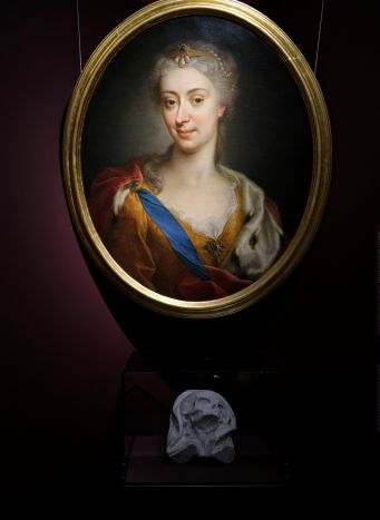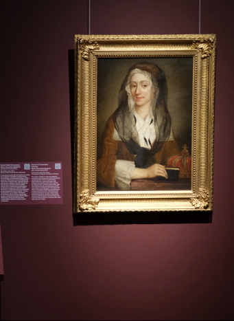 Portret Marii Klementyny Sobieskiej w wersji dotykowej, dotykają go damskie dłonie.